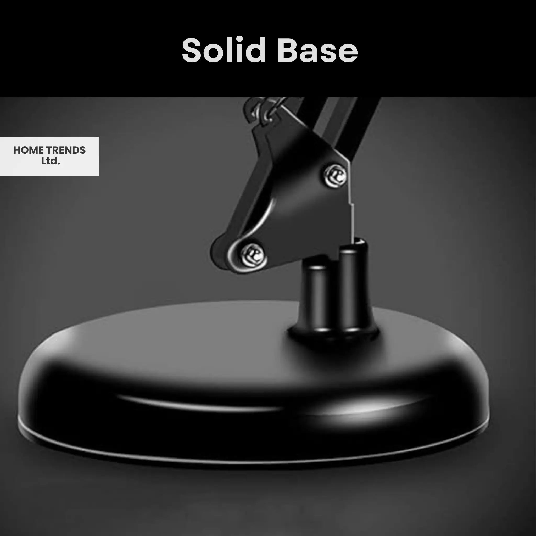 Stability & Build: Built-in Base Stabilizer & American Metal Construction. The heavy-duty base remains sturdy and secure during adjustment, preventing tipping. The metal build ensures durability and a premium, minimalist aesthetic.