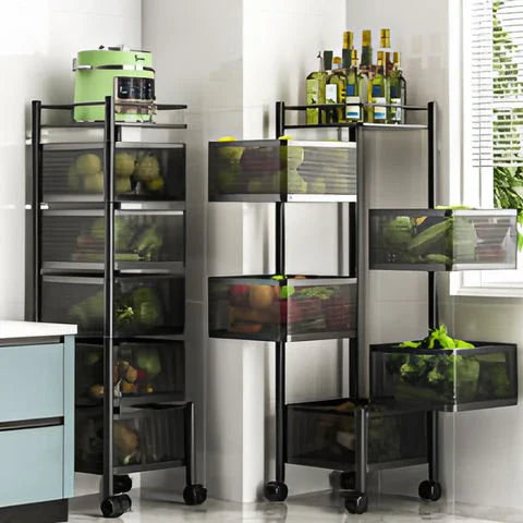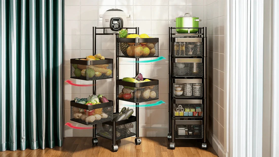 Multi-Tier Rolling Storage Cart – A versatile and space-saving kitchen organizer with rotating or stackable baskets, perfect for fruits, vegetables, and pantry items.